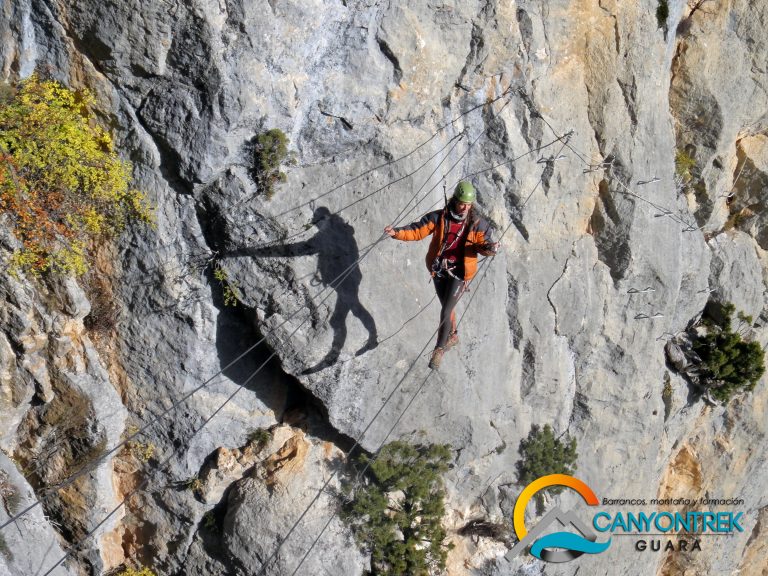 Les via ferrata de la Sierra de Guara proposées avec accompagnement guidé sont équipées d’une ligne de vie (câble en acier) sur tout le parcours, ce qui permet d’être assuré en permanence.